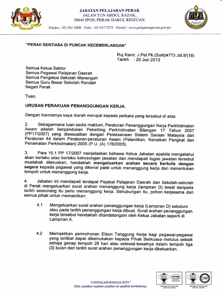 Arahan penanggungan kerja seseorang pegawai hendaklah dibuat secara bertulis oleh Ketua Jabatan. Pelajar Hantar SURATJAWAPANterima-Borang LEPAS TANGGUNG-AkuJanji.